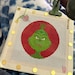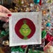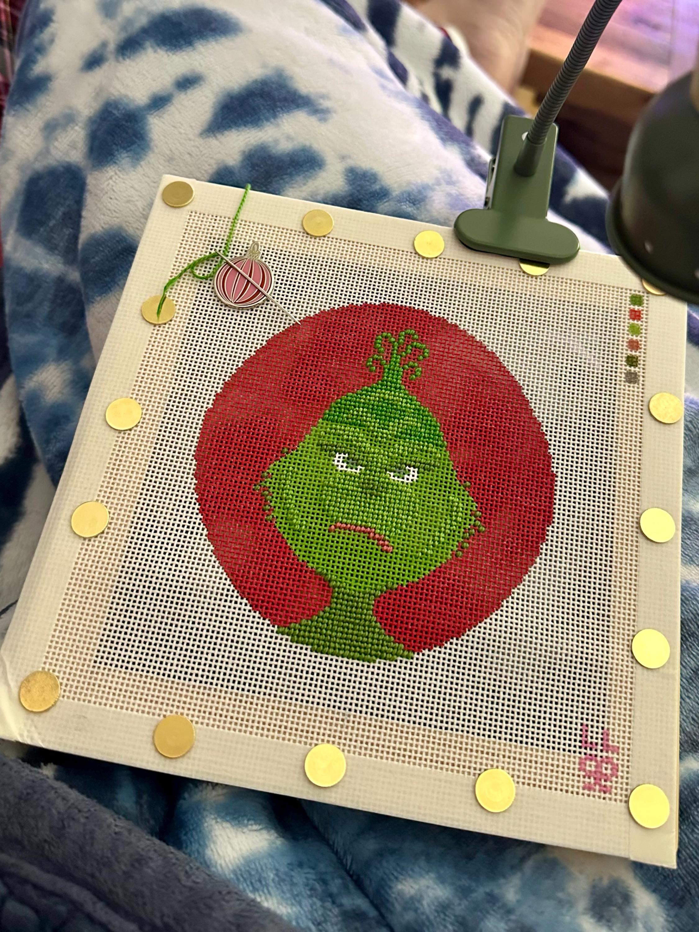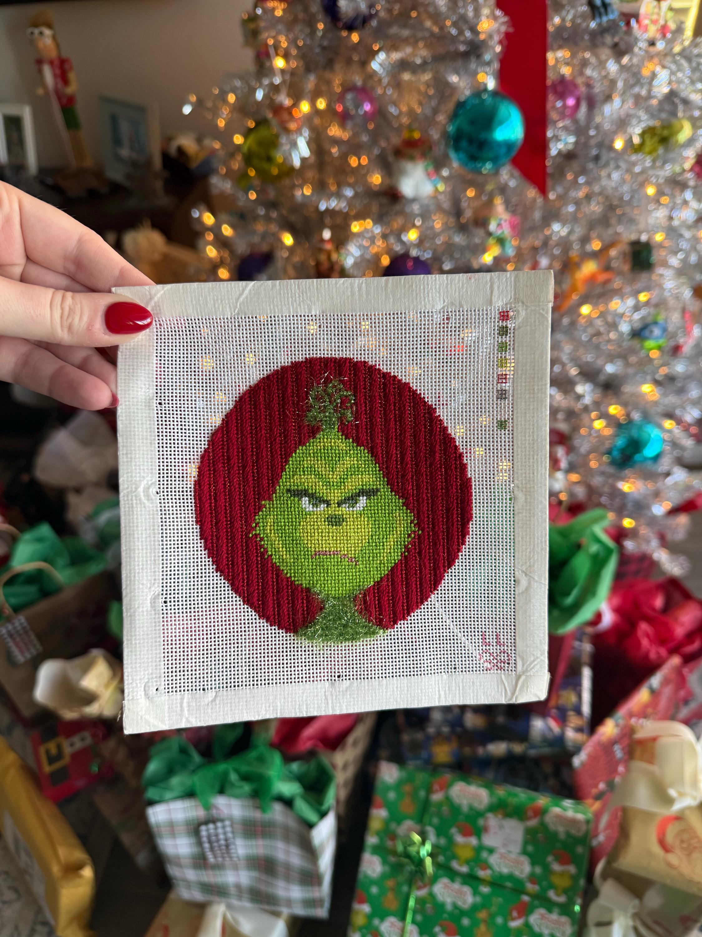 Adorable hand-painted New Animated Grinch inspired Christmas needlepoint canvas. Would make a super cute Christmas ornament! Such a cute canvas to stitch and feature in your WIP Wednesday or Stitch Mail Monday!