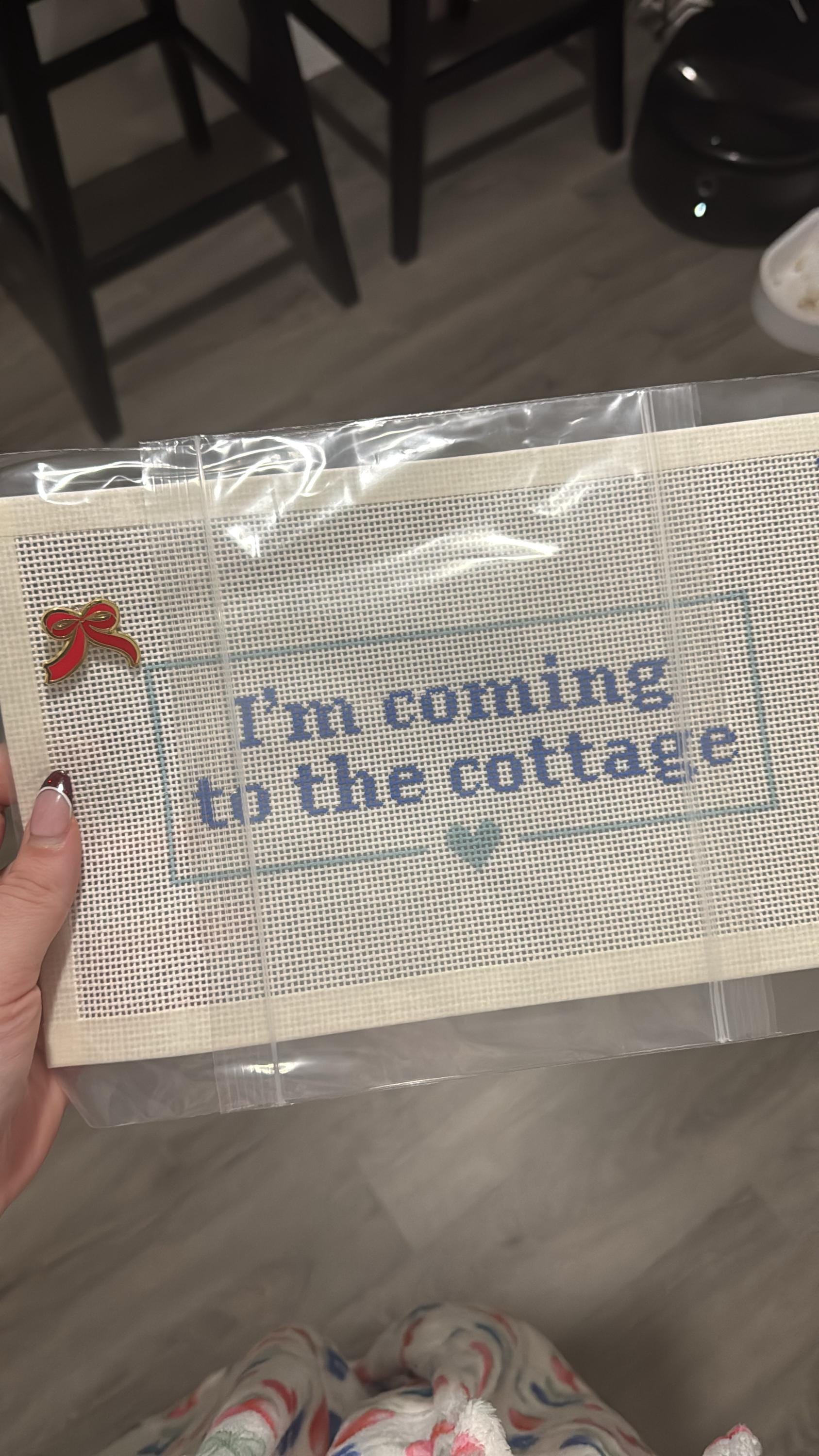 “I’m Coming to the Cottage” hand-painted needlepoint canvas. Perfect homage to Heated Rivalry obsessed fan girls. For fans who understand that going to the cottage is a promise. Pairs well with slow burns, dock beers, and secret hookups. Shane and Ilya would approve!